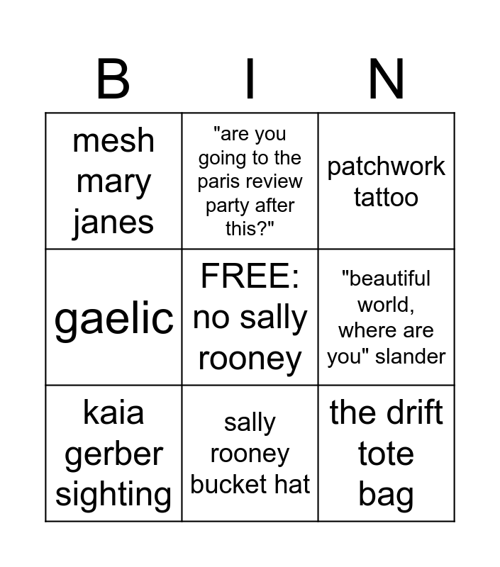 This bingo card has a free space and 8 words: "beautiful world, where are you" slander, patchwork tattoo, "are you going to the paris review party after this?", kaia gerber sighting, mesh mary janes, the drift tote bag, gaelic and sally rooney bucket hat.