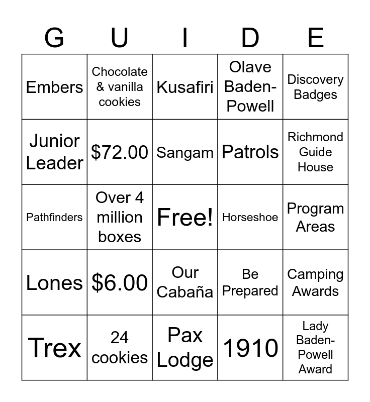 This bingo card has a free space and 44 words: Five (5), $6.00, Five (5), 1910, Girls First, Sparks, $72.00, Our Chalet, Olave Baden-Powell, Lady Baden-Powell Award, Embers, 24 cookies, Be Prepared, Program Areas, Guides, Mint cookies, Pax Lodge, Horseshoe, Program Themes, Pathfinders, Chocolate & vanilla cookies, Our Cabaña, Taps, Discovery Badges, Rangers, Fundraise money, Sangam, Enrollment Ceremony, Camping Awards, Trex, 1927, Kusafiri, Advancement Ceremony, Insignia, Lones, Regina, Saskatchewan, Thinking Day, Bridging Meeting, Richmond Guide House, Junior Leader, Over 4 million boxes, WAGGGS, Patrols and Camp Olave.