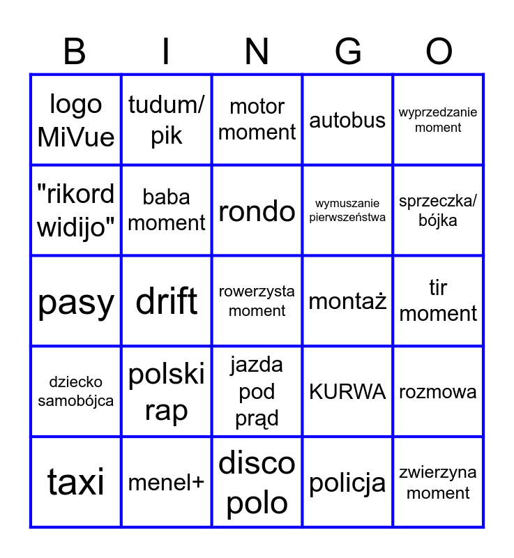 This bingo card has 25 words: polski rap, disco polo, rondo, taxi, wyprzedzanie moment, logo MiVue, "rikord widijo", tudum/ pik, montaż, jazda pod prąd, wymuszanie pierwszeństwa, pasy, KURWA, rozmowa, baba moment, zwierzyna moment, tir moment, motor moment, sprzeczka/ bójka, drift, rowerzysta moment, menel+, dziecko samobójca, autobus and policja.
