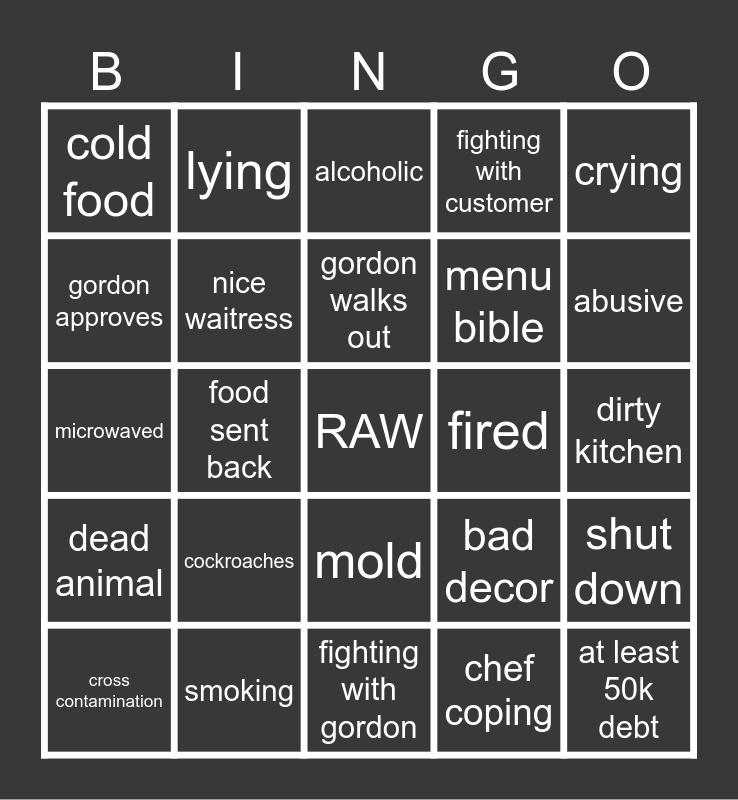 This bingo card has a free space and 24 words: cockroaches, smoking, gordon walks out, cross contamination, crying, cold food, gordon approves, lying, fired, mold, menu bible, microwaved, bad decor, shut down, nice waitress, chef coping, dirty kitchen, alcoholic, abusive, food sent back, at least 50k debt, dead animal, fighting with customer and fighting with gordon.