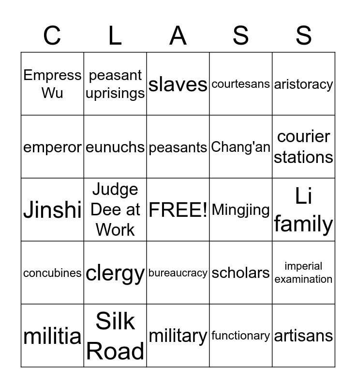 This bingo card has a free space and 24 words: clergy, Silk Road, peasants, militia, aristoracy, Empress Wu, emperor, peasant uprisings, Mingjing, bureaucracy, Chang'an, Jinshi, scholars, imperial examination, eunuchs, functionary, Li family, slaves, courier stations, Judge Dee at Work, artisans, concubines, courtesans and military.