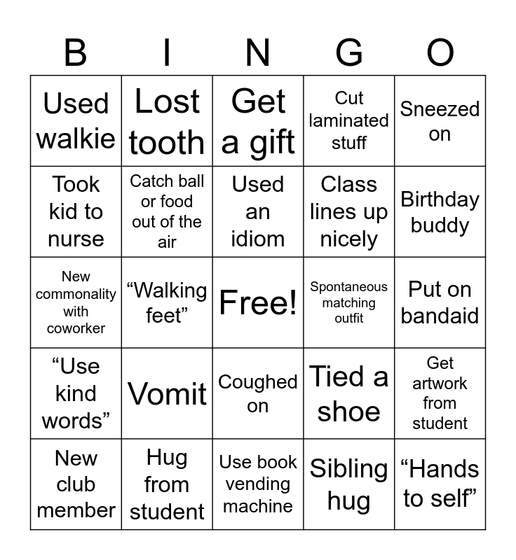 This bingo card has a free space and 24 words: Vomit, Hug from student, Used an idiom, New club member, Sneezed on, Used walkie, Took kid to nurse, Lost tooth, Spontaneous matching outfit, Coughed on, Class lines up nicely, New commonality with coworker, Tied a shoe, Get artwork from student, Catch ball or food out of the air, Sibling hug, Put on bandaid, Get a gift, Birthday buddy, “Walking feet”, “Hands to self”, “Use kind words”, Cut laminated stuff and Use book vending machine.