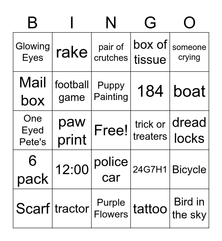 This bingo card has a free space and 25 words: 12:00, Purple Flowers, Puppy Painting, Scarf, someone crying, Glowing Eyes, Mail box, rake, trick or treaters, police car, 184, One Eyed Pete's, 24G7H1, Bicycle, football game, stuffed fish, dread locks, pair of crutches, boat, paw print, Bird in the sky, tractor, 6 pack, box of tissue and tattoo.