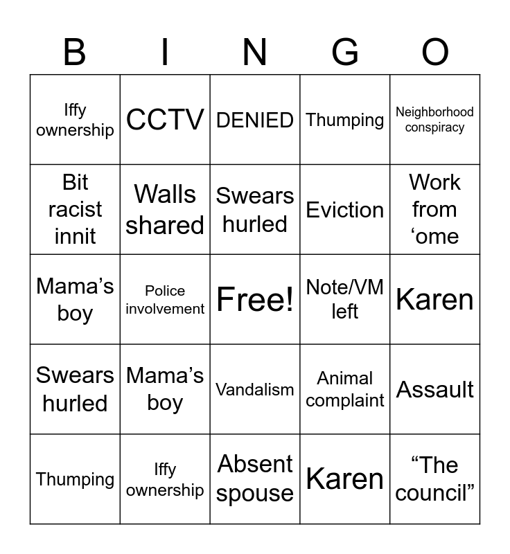 This bingo card has a free space and 48 words: -by/-ly, “The council”, Work from ‘ome, Absent spouse, Mama’s boy, Moving house, CCTV, Hoarder house, Bit racist innit, NEET, Walls shared, Thumping, Assault, Animal complaint, British cuisine, Petty citation, Swears hurled, Note/VM left, Landscaping issue, Neighborhood conspiracy, Police involvement, Karen, Iffy ownership, Eviction, Sensible hair, Work from ‘ome, Thumping, Moving house, Vandalism, Swears hurled, NEET, Extensive documentation, Landscaping issue, Absent spouse, Iffy ownership, Conviction, Note/VM left, Karen, Bit racist innit, “The council”, -by/-ly, Threats, DENIED, Assault, Mama’s boy, Fine levied, Theft and English rose.