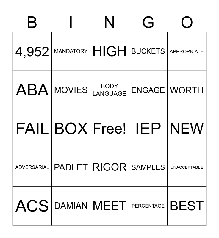 This bingo card has a free space and 25 words: PADLET, MEET, BODY LANGUAGE, ACS, APPROPRIATE, 4,952, ABA, MANDATORY, IEP, RIGOR, ENGAGE, FAIL, SAMPLES, UNACCEPTABLE, MOVIES, TEMPLATES, NEW, HIGH, WORTH, BOX, BEST, DAMIAN, ADVERSARIAL, BUCKETS and PERCENTAGE.