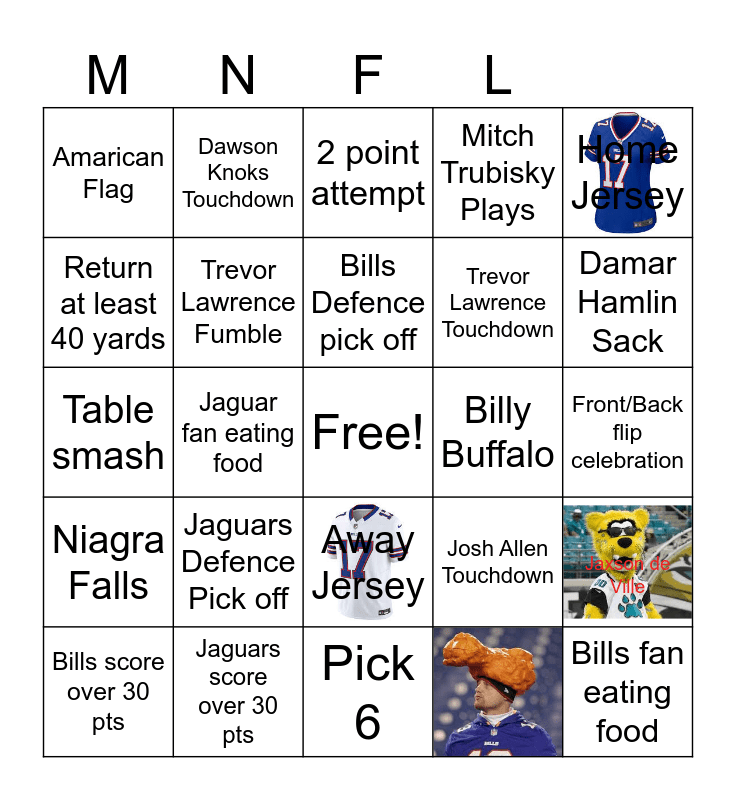 This bingo card has 5 images, a free space and 26 words: Josh Allen Touchdown, Cook Touchdown, Trevor Lawrence Touchdown, Pick 6, Return at least 40 yards, 2 point attempt, Dawson Knoks Touchdown, Niagra Falls, Billy Buffalo, Jaxson de Ville, Table smash, Mitch Trubisky Plays, Bills score over 30 pts, Jaguars score over 30 pts, Damar Hamlin Sack, Josh Allen Fumble, Trevor Lawrence Fumble, Bills Defence pick off, Jaguars Defence Pick off, Amarican Flag, Front/Back flip celebration, Jaguar fan eating food, Bills fan eating food, Away Jersey, Home Jersey and Color Rush Jersey.