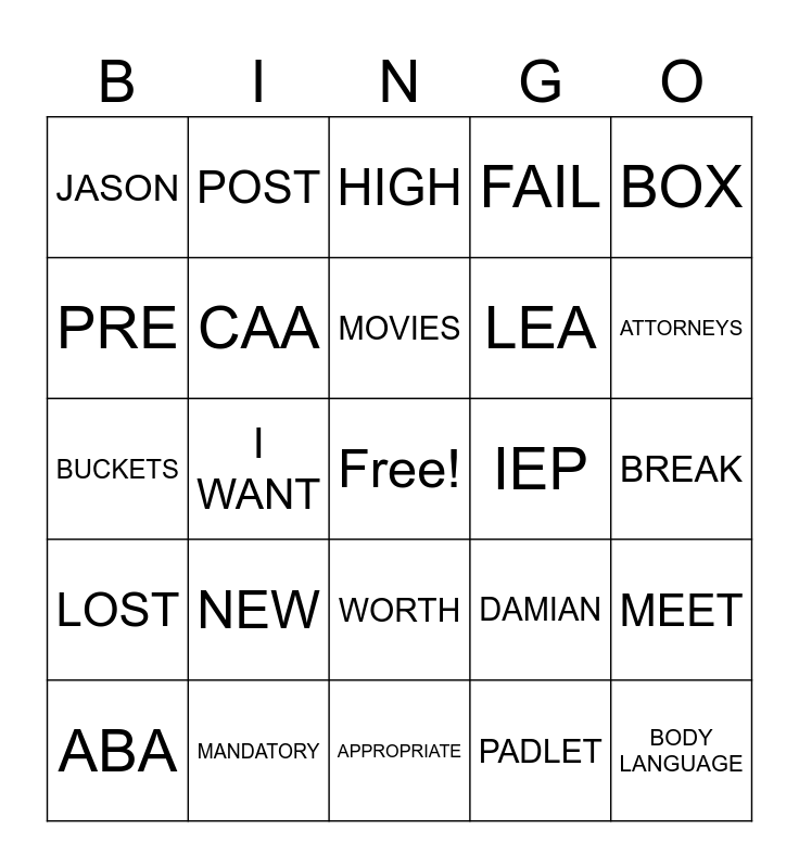This bingo card has a free space and 42 words: UNACCEPTABLE, MOVIES, TEMPLATES, NEW, PADLET, MEET, BODY LANGUAGE, ACS, HIGH, WORTH, BREAK, ATTORNEYS, I WANT, BOX, BEST, DAMIAN, ADVERSARIAL, BUCKETS, PERCENTAGE, POST, PRE, 40, ENGLISH LEARNER, JASON, 80, SLI, LEA, ALL, INCREASE, AGENDA, ERRORS, LOST, CAA, APPROPRIATE, 4,952, ABA, MANDATORY, IEP, RIGOR, ENGAGE, FAIL and SAMPLES.