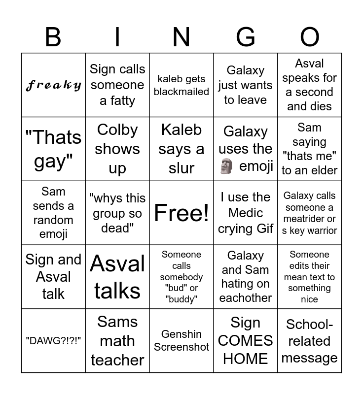 This bingo card has a free space and 24 words: Asval talks, Sams math teacher, Kaleb says a slur, "DAWG?!?!", Asval speaks for a second and dies, 𝓯𝓻𝓮𝓪𝓴𝔂, "Thats gay", Sign calls someone a fatty, I use the Medic crying Gif, Someone calls somebody "bud" or "buddy", Galaxy uses the 🗿 emoji, Sam sends a random emoji, Galaxy and Sam hating on eachother, Someone edits their mean text to something nice, Colby shows up, Sign COMES HOME, Galaxy calls someone a meatrider or s key warrior, kaleb gets blackmailed, Sam saying "thats me" to an elder, "whys this group so dead", School-related message, Sign and Asval talk, Galaxy just wants to leave and Genshin Screenshot.
