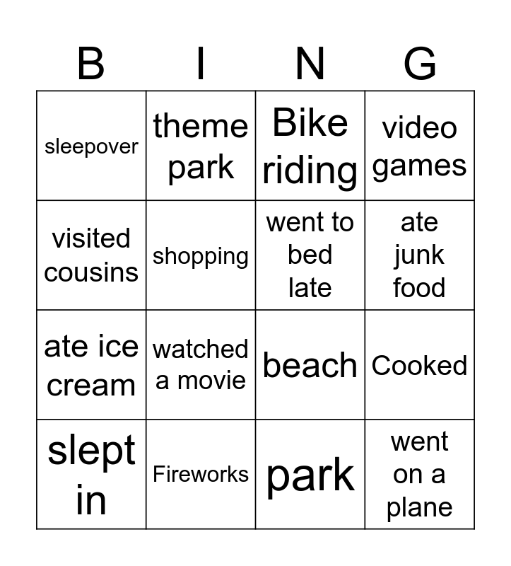 This bingo card has 16 words: Fireworks, Cooked, Bike riding, sleepover, ate ice cream, theme park, beach, park, visited cousins, shopping, slept in, video games, watched a movie, ate junk food, went to bed late and went on a plane.