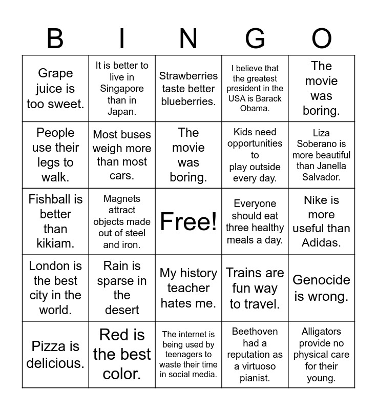 This bingo card has a free space and 24 words: Rain is sparse in the desert, Red is the best color., The movie was boring., Pizza is delicious., The movie was boring., Grape juice is too sweet., People use their legs to walk., It is better to live in Singapore than in Japan., Everyone should eat three healthy meals a day., My history teacher hates me., Kids need opportunities to play outside every day., Fishball is better than kikiam., Trains are fun way to travel., Genocide is wrong., Most buses weigh more than most cars., Beethoven had a reputation as a virtuoso pianist., Nike is more useful than Adidas., Strawberries taste better blueberries., Liza Soberano is more beautiful than Janella Salvador., Magnets attract objects made out of steel and iron., Alligators provide no physical care for their young., London is the best city in the world., I believe that the greatest president in the USA is Barack Obama. and The internet is being used by teenagers to waste their time in social media..