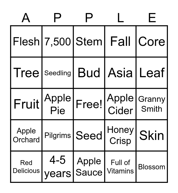 This bingo card has a free space and 24 words: Red Delicious, Pilgrims, Bud, Full of Vitamins, Core, Flesh, 7,500, Stem, Apple Cider, Granny Smith, Fruit, Seedling, Honey Crisp, Skin, Tree, 4-5 years, Apple Sauce, Fall, Leaf, Apple Orchard, Apple Pie, Seed, Asia and Blossom.