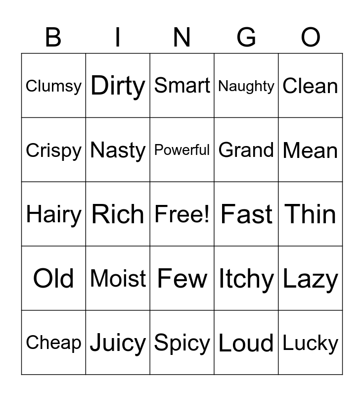 This bingo card has a free space and 24 words: Moist, Juicy, Powerful, Cheap, Clean, Clumsy, Crispy, Dirty, Fast, Few, Grand, Hairy, Itchy, Lazy, Nasty, Loud, Thin, Smart, Mean, Rich, Lucky, Old, Naughty and Spicy.