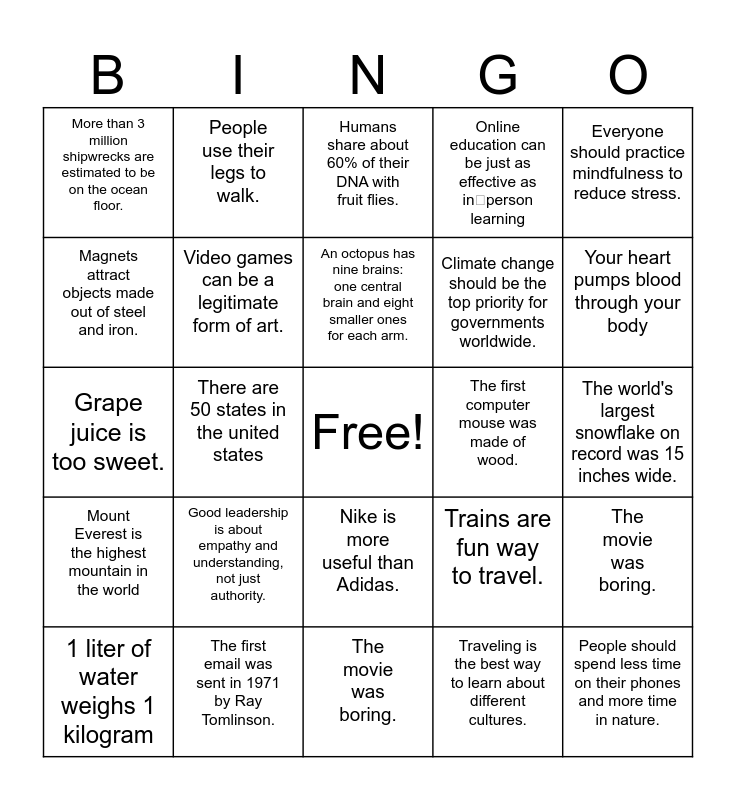 This bingo card has a free space and 24 words: 1 liter of water weighs 1 kilogram, Good leadership is about empathy and understanding, not just authority., An octopus has nine brains: one central brain and eight smaller ones for each arm., Traveling is the best way to learn about different cultures., Everyone should practice mindfulness to reduce stress., More than 3 million shipwrecks are estimated to be on the ocean floor., People use their legs to walk., Humans share about 60% of their DNA with fruit flies., The first computer mouse was made of wood., The world's largest snowflake on record was 15 inches wide., Grape juice is too sweet., Video games can be a legitimate form of art., Trains are fun way to travel., The movie was boring., Magnets attract objects made out of steel and iron., The first email was sent in 1971 by Ray Tomlinson., The movie was boring., Online education can be just as effective as inperson learning, Your heart pumps blood through your body, Mount Everest is the highest mountain in the world, There are 50 states in the united states, Nike is more useful than Adidas., Climate change should be the top priority for governments worldwide. and People should spend less time on their phones and more time in nature..