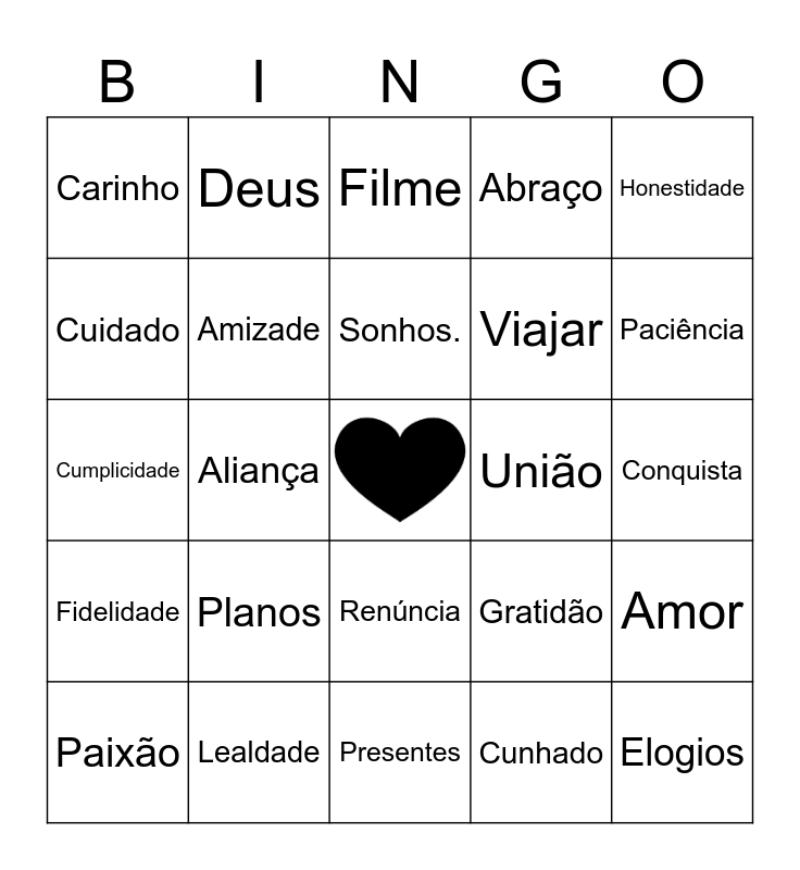 This bingo card has a free space and 29 words: Perdão, Lealdade, Filme, Casamento, Honestidade, Carinho, Amizade, Sonhos., União, Amor, Paixão, Aliança, Cunhado, Elogios, Cumplicidade, Simpatia, Presentes, Gratidão, Paciência, Fidelidade, Planos, Romance, Viajar, Conquista, Cuidado, Deus, Renúncia, Abraço and Lua de mel.