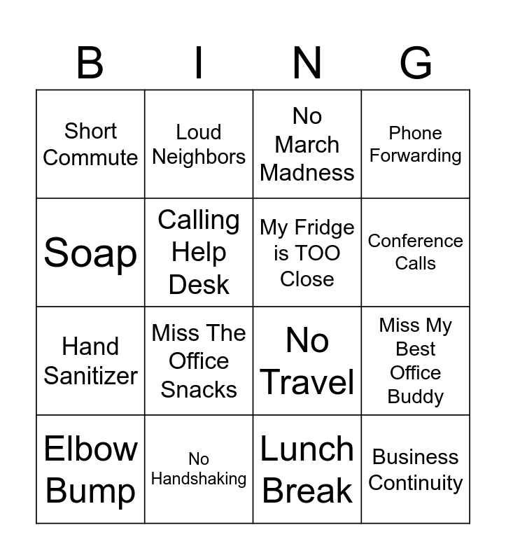 This bingo card has 55 words: PJs All Day, Kitchen Table Desk, Not Missing Traffic, Short Commute, dual monitors, Snuggled My Pet, My Fridge is TOO Close, Full Screen Freeze, Hand Sanitizer, New Co-Workers at Home, Phone Forwarding, Coffee All Day, Hand Washing, Social Distancing, Toilet Paper, Disinfectant, Soap, Miss My Best Office Buddy, Stepping Out for Fresh Air, Elbow Bump, No Handshaking, Clorox Wipes, Bleach, No March Madness, Longing for office birthday treat day, Conference Calls, Video Calls, Netflix, Lunch Break, VPN, Wireless Internet, Jabber, Shoulder Taps/Drive-bys, Alone time, Calling Help Desk, No Travel, Facetime, Business Continuity, Flexibility, Thermostat Battles, Loud Neighbors, Cancelled Vacation, No Traffic, Stay Home Stay Safe, Quarantine, Hazmat is the new Onsie, Temporarily Out of Stock, Left Something Important In The Office, Enjoying WFH, Miss The Office Snacks, Virtual Happy Hour, Can't Wait for Happy Hour, Cozy Socks, Laugh to keep from freaking out and Only hear every fifth word but get the gist.