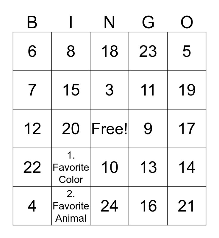 This bingo card has a free space and 24 words: 1. Favorite Color, 2. Favorite Animal, 3, 4, 5, 6, 7, 8, 9, 10, 11, 12, 13, 14, 15, 16, 17, 18, 19, 20, 21, 22, 23 and 24.