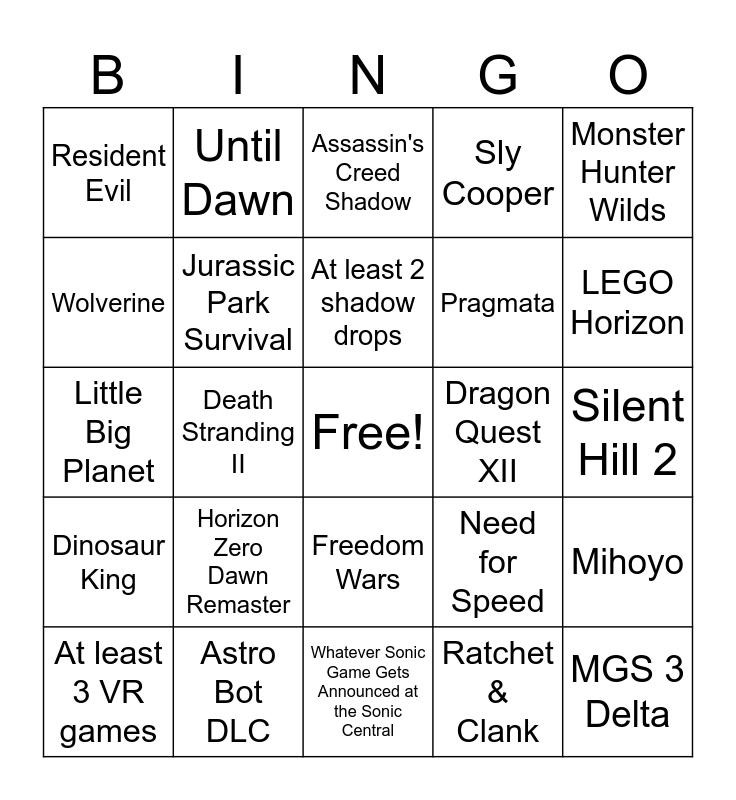 This bingo card has a free space and 24 words: Horizon Zero Dawn Remaster, Astro Bot DLC, At least 2 shadow drops, At least 3 VR games, Monster Hunter Wilds, Resident Evil, Wolverine, Until Dawn, Dragon Quest XII, Freedom Wars, Pragmata, Little Big Planet, Need for Speed, Mihoyo, Jurassic Park Survival, Ratchet & Clank, Silent Hill 2, Assassin's Creed Shadow, LEGO Horizon, Death Stranding II, MGS 3 Delta, Dinosaur King, Sly Cooper and Whatever Sonic Game Gets Announced at the Sonic Central.