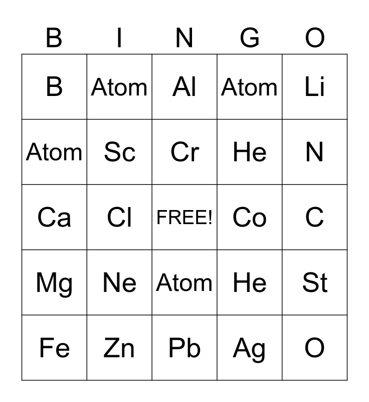 This bingo card has a free space and 29 words: H, Zn, Al, Cu, Li, B, Sc, Cr, Co, St, Fe, Cl, Ag, O, Ca, Na, Pb, He, N, Mg, Ne, Ti, He, C, Atom, Atom, Atom, Atom and Atom.