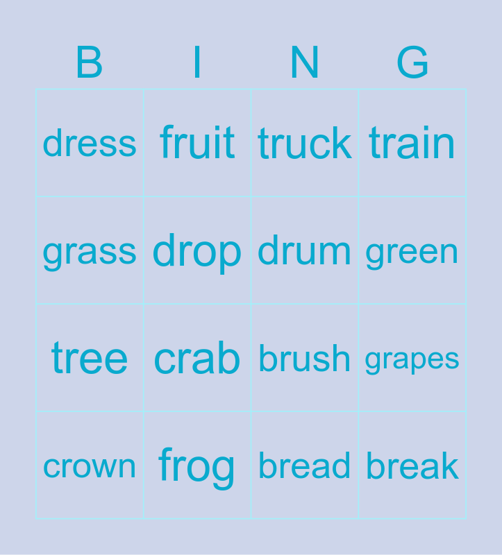 This bingo card has 16 words: frog, grapes, truck, dress, tree, fruit, brush, bread, grass, drop, crown, train, crab, green, drum and break.