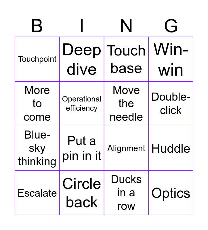 This bingo card has 21 words: Circle back, Low-hanging fruit, Deep dive, Leverage, Ducks in a row, Move the needle, Touchpoint, Touch base, Alignment, Double-click, Blue-sky thinking, Win-win, Optics, Streamline, Operational efficiency, Pain points, Escalate, Put a pin in it, More to come, Huddle and Drill down.