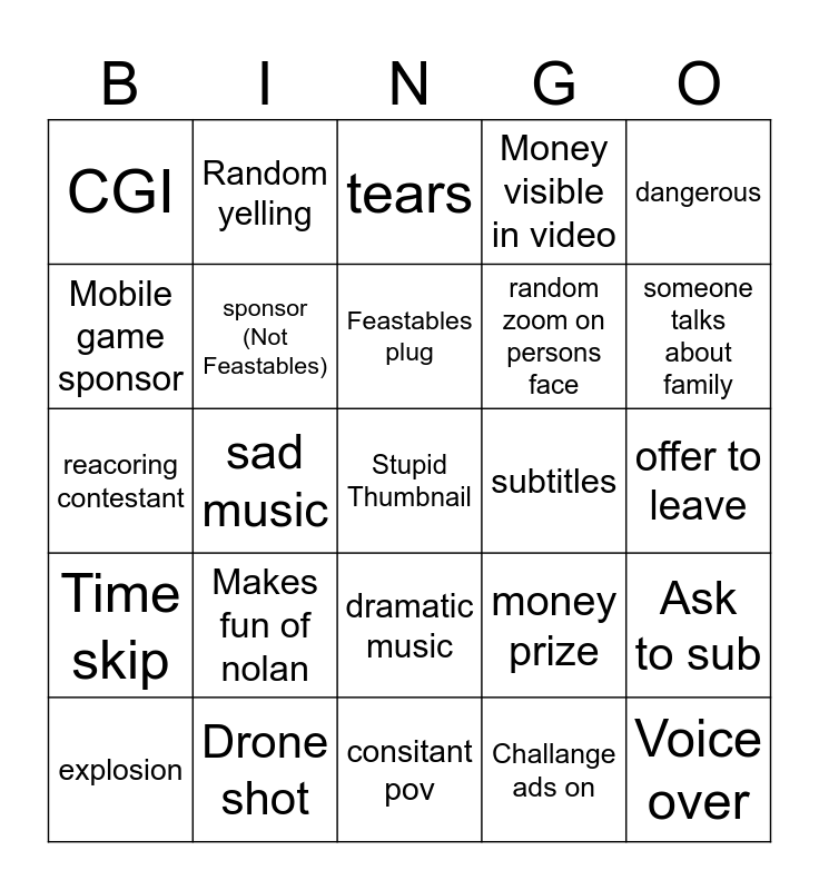 This bingo card has a free space and 24 words: Makes fun of nolan, Drone shot, Feastables plug, explosion, dangerous, CGI, Mobile game sponsor, Random yelling, subtitles, dramatic music, random zoom on persons face, reacoring contestant, money prize, Ask to sub, sponsor (Not Feastables), Challange ads on, offer to leave, tears, someone talks about family, sad music, Voice over, Time skip, Money visible in video and consitant pov.