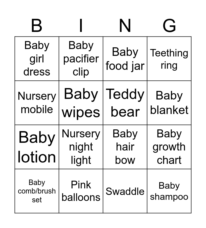 This bingo card has 24 words: Free!, Rocking chair, Baby blanket, Baby bottle, Nursery mobile, Baby girl dress, Baby wipes, Baby pacifier clip, Pink balloons, Baby hand mittens, Baby lotion, Baby hair bow, Baby monitor, Baby girl scrapbook, Teddy bear, Personalized baby blanket, Swaddle, Baby food jar, Nursery night light, Baby growth chart, Baby comb/brush set, Baby shampoo, Teething ring and Crib.