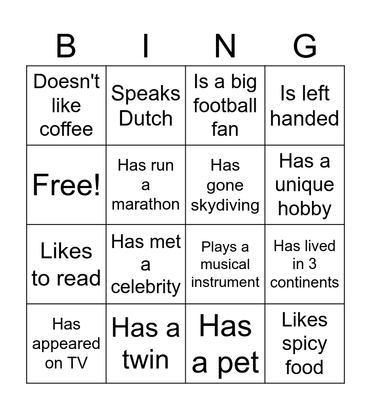 This bingo card has 16 words: Has a twin, Has lived in 3 continents, Is a big football fan, Doesn't like coffee, Likes to read, Speaks Dutch, Plays a musical instrument, Has a pet, Free!, Has run a marathon, Has appeared on TV, Is left handed, Has met a celebrity, Has a unique hobby, Has gone skydiving and Likes spicy food.