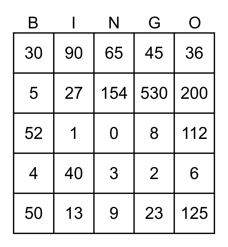 This bingo card has a free space and 24 words: 40, 13, 154, 50, 36, 30, 5, 90, 8, 3, 530, 52, 2, 6, 27, 23, 112, 65, 200, 1, 125, 4, 45 and 9.