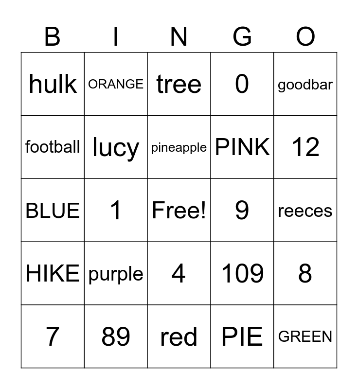 This bingo card has a free space and 34 words: burgundy, apple, hot apple, pumpkin patch, reeces, football, lucy, red, PINK, GREEN, BLUE, ORANGE, PIE, GRANNY, HIKE, 1, 4, 9, 8, 7, 89, 9, 0, 12, hotbrown, purple, tree, woods, goodbar, hulk, cinnamon, pineapple, 109 and 9239.