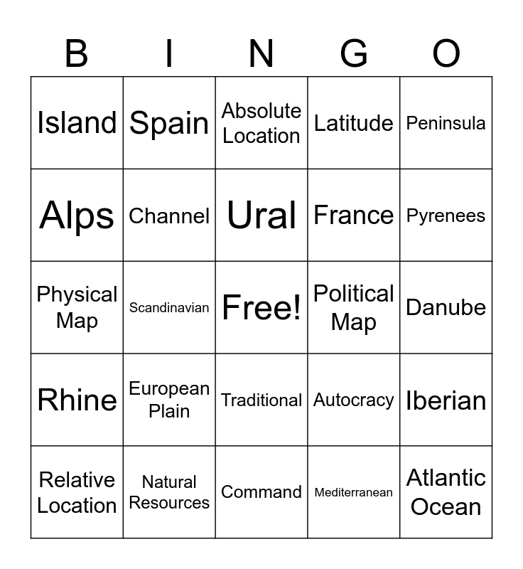 This bingo card has a free space and 24 words: European Plain, Natural Resources, Ural, Relative Location, Peninsula, Island, Alps, Spain, Political Map, Traditional, France, Physical Map, Autocracy, Iberian, Channel, Mediterranean, Danube, Absolute Location, Pyrenees, Scandinavian, Atlantic Ocean, Rhine, Latitude and Command.