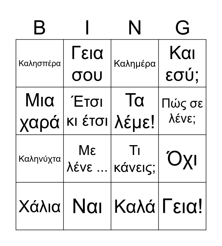 This bingo card has 16 words: Ναι, Όχι, Καλημέρα, Καλησπέρα, Καληνύχτα, Γεια σου, Τι κάνεις;, Καλά, Μια χαρά, Έτσι κι έτσι, Χάλια, Και εσύ;, Με λένε ..., Πώς σε λένε;, Τα λέμε! and Γεια!.