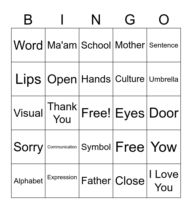 This bingo card has a free space and 24 words: Communication, Expression, Hands, Alphabet, Sentence, Word, Lips, Ma'am, Eyes, Symbol, Culture, Visual, Free, Yow, Open, Close, Door, School, Umbrella, Thank You, I Love You, Sorry, Mother and Father.