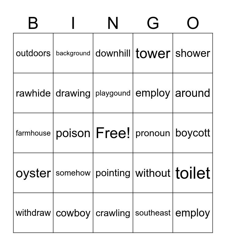 This bingo card has a free space and 24 words: somehow, cowboy, playgound, withdraw, shower, outdoors, rawhide, background, pronoun, pointing, employ, farmhouse, without, toilet, drawing, southeast, boycott, downhill, around, poison, employ, oyster, tower and crawling.