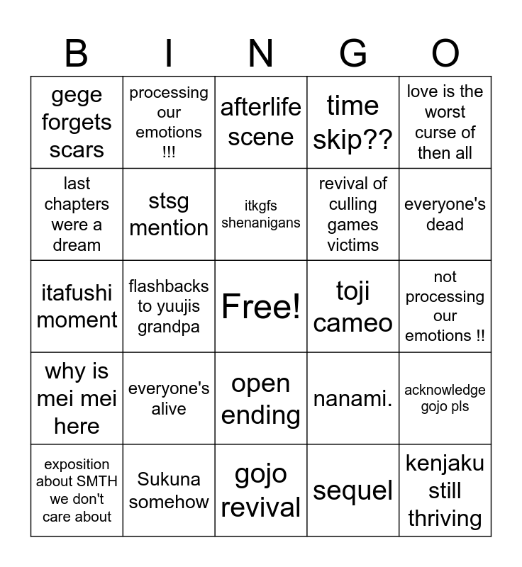 This bingo card has a free space and 24 words: everyone's alive, Sukuna somehow, itkgfs shenanigans, exposition about SMTH we don't care about, love is the worst curse of then all, gege forgets scars, last chapters were a dream, processing our emotions !!!, toji cameo, open ending, revival of culling games victims, itafushi moment, nanami., acknowledge gojo pls, stsg mention, sequel, not processing our emotions !!, afterlife scene, everyone's dead, flashbacks to yuujis grandpa, kenjaku still thriving, why is mei mei here, time skip?? and gojo revival.