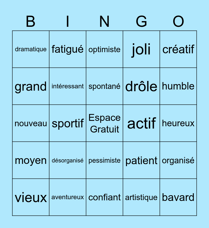 This bingo card has a free space and 50 words: amusant, bavard, compatissant, confiant, désorganisé, fâché, fatigué, fort, grand, intelligent, intéressant, joli, organisé, patient, petit, poli, spontané, actif, compétitif, créatif, sportif, artistique, dramatique, drôle, énergique, honnête, humble, jeune, optimiste, pessimiste, sociable, timide, triste, ambitieux, aventureux, courageux, curieux, ennuyeux, généreux, heureux, paresseux, studieux, talentueux, beau, vieux, nouveau, bon, mauvais, moyen and gros.