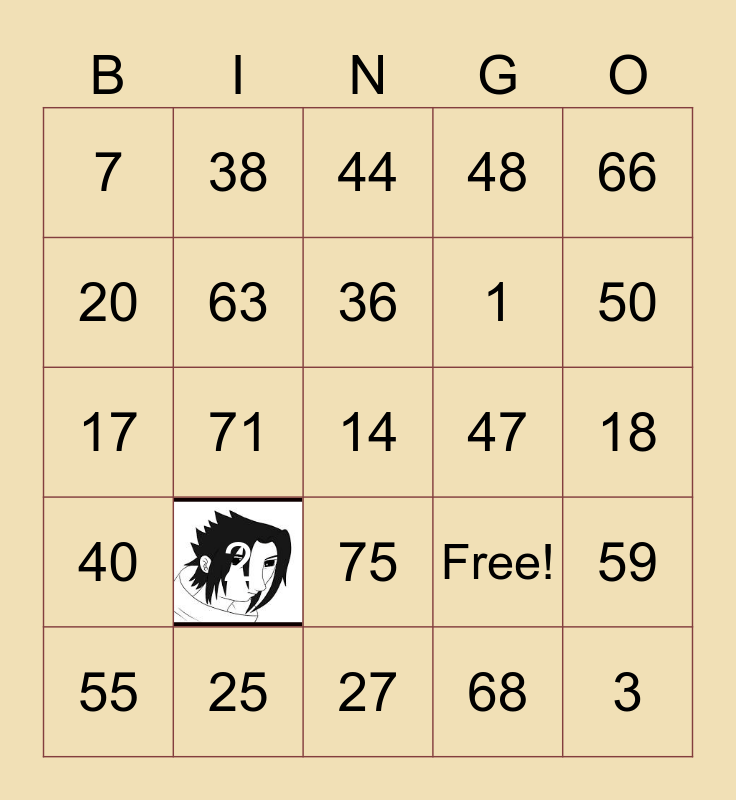 This bingo card has 1 images and 25 words: 2, 27, 36, 55, 66, 7, 20, 38, 47, 75, 1, 17, Free!, 59, 63, 3, 18, 44, 50, 71, 14, 25, 40, 48 and 68.
