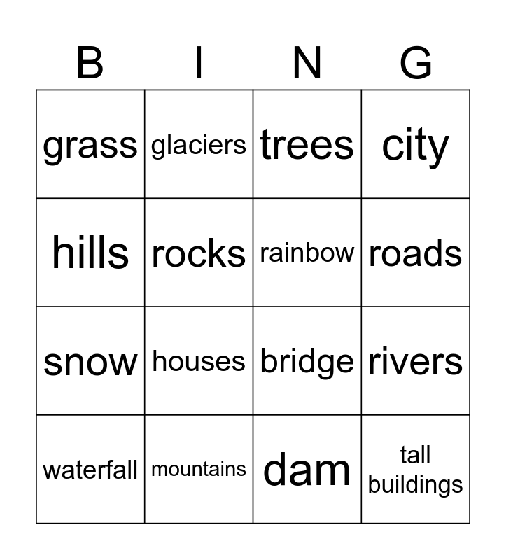 This bingo card has 16 words: mountains, rivers, trees, grass, snow, glaciers, bridge, dam, hills, rocks, waterfall, city, houses, roads, rainbow and tall buildings.