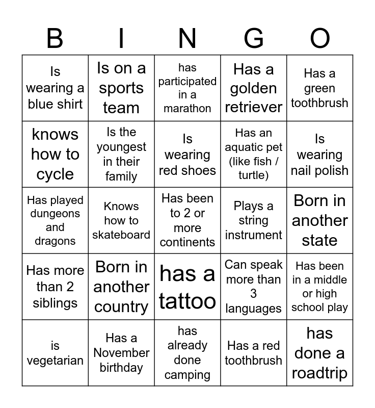 This bingo card has 25 words: Born in another country, has already done camping, Is wearing red shoes, is vegetarian, Has a green toothbrush, Is wearing a blue shirt, knows how to cycle, Is on a sports team, Plays a string instrument, has a tattoo, Has an aquatic pet (like fish / turtle), Has played dungeons and dragons, Can speak more than 3 languages, Has been in a middle or high school play, Is the youngest in their family, has done a roadtrip, Born in another state, has participated in a marathon, Is wearing nail polish, Knows how to skateboard, Has been to 2 or more continents, Has a November birthday, Has more than 2 siblings, Has a golden retriever and Has a red toothbrush.