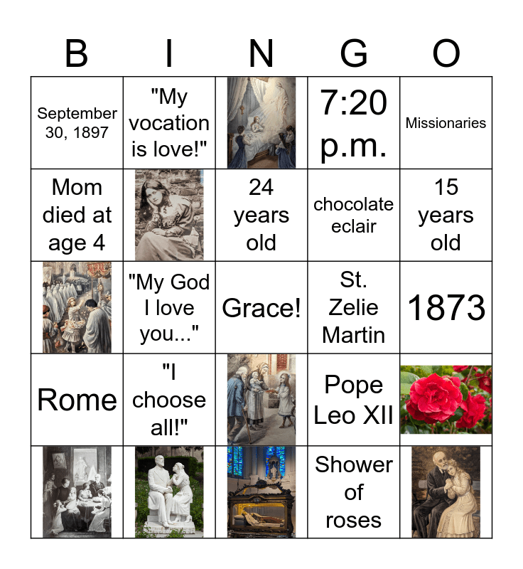 This bingo card has 9 images, a free space and 15 words: "I choose all!", 24 years old, Missionaries, September 30, 1897, Mom died at age 4, "My vocation is love!", St. Zelie Martin, chocolate eclair, Pope Leo XII, Shower of roses, 1873, 15 years old, "My God I love you...", Rome and 7:20 p.m..