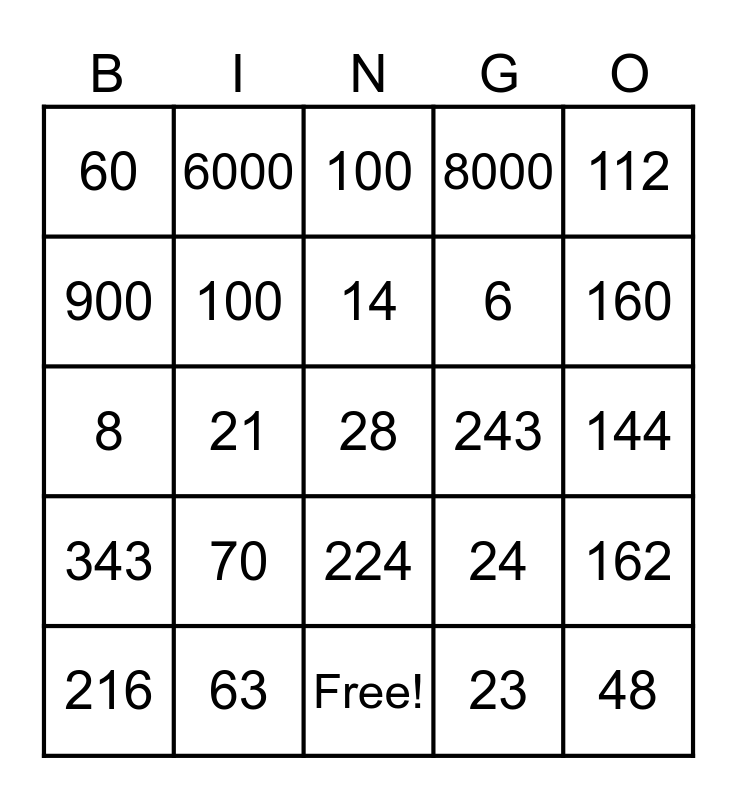 This bingo card has 25 words: 343, 63, 28, 23, 112, 60, 6000, 100, 243, 162, 900, 100, Free!, 24, 160, 216, 21, 14, 6, 144, 8, 70, 224, 8000 and 48.
