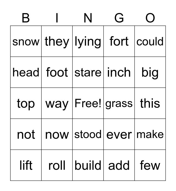 This bingo card has a free space and 29 words: lift, small, way, great, snow, lying, foot, now, grass, roll, this, few, build, add, big, bare, stood, not, could, top, ever, that, inch, head, fort, they, make, stare and name.