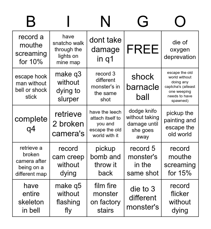 This bingo card has 35 words: record yourself emoting infront of a monster, purchase most expensive ancient gestures, complete sponsorship, make q3 without dying to slurper, pickup bomb and throw it back, FREE, escape hook man without bell or shock stick, make a quota without dying, record 3 different monster's in the same shot, complete q5, complete q4, die of oxygen deprevation, have over 1000 money, get half of quota in one day, record a mouthe screaming for 10%, dodge knifo without taking damage until she goes away, die to 3 different monster's, retrieve 2 broken camera's, retrieve a broken camera after being on a different map, have the leech attach itself to you and escape the old world with it, record 5 monster's in the same shot, have entire skeleton in bell, record mouthe screaming for 15%, make q5 without flashing fly, dont take damage in q1, escape the old world without doing any captcha's (alteast one weeping needs to have spawned), record flicker without dying, press button spider and record it, shock barnacle ball, pickup the painting and escape the old world, shock bigslap, film fire monster on factory stairs, record cam creep without dying, have snatcho walk through the lights on mine map and this one is free but only if you admit that you are an idiot.