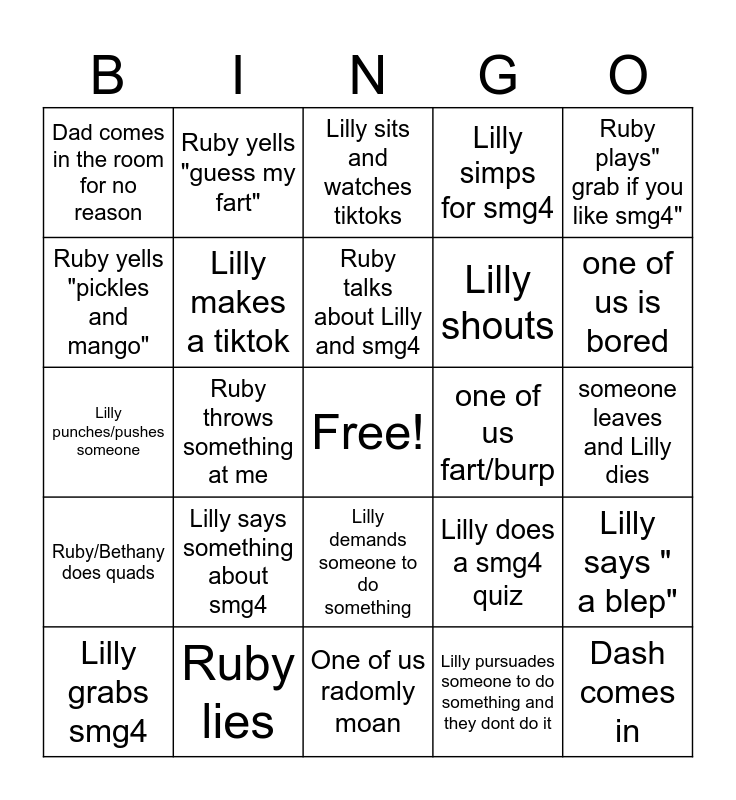 This bingo card has a free space and 24 words: Lilly says something about smg4, Ruby lies, Ruby talks about Lilly and smg4, Lilly grabs smg4, Ruby plays" grab if you like smg4", Dad comes in the room for no reason, Ruby yells "pickles and mango", Ruby yells "guess my fart", one of us fart/burp, Lilly demands someone to do something, Lilly shouts, Lilly punches/pushes someone, Lilly does a smg4 quiz, Lilly says " a blep", Lilly makes a tiktok, Lilly pursuades someone to do something and they dont do it, someone leaves and Lilly dies, Lilly sits and watches tiktoks, one of us is bored, Ruby throws something at me, Dash comes in, Ruby/Bethany does quads, Lilly simps for smg4 and One of us radomly moan.