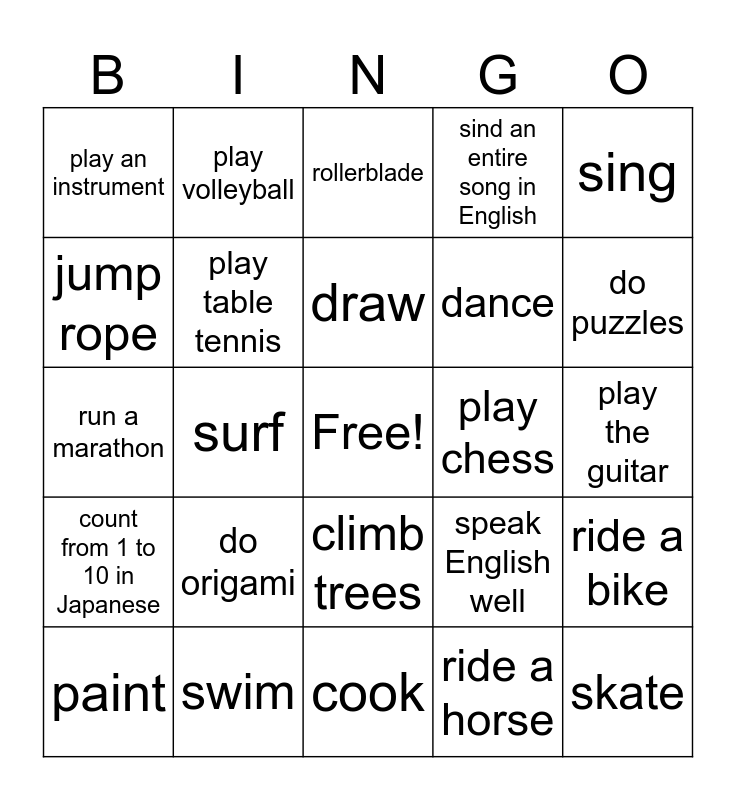 This bingo card has a free space and 24 words: do origami, swim, draw, paint, sing, play an instrument, jump rope, play volleyball, play chess, climb trees, dance, run a marathon, speak English well, ride a bike, play table tennis, ride a horse, play the guitar, rollerblade, do puzzles, surf, skate, count from 1 to 10 in Japanese, sind an entire song in English and cook.