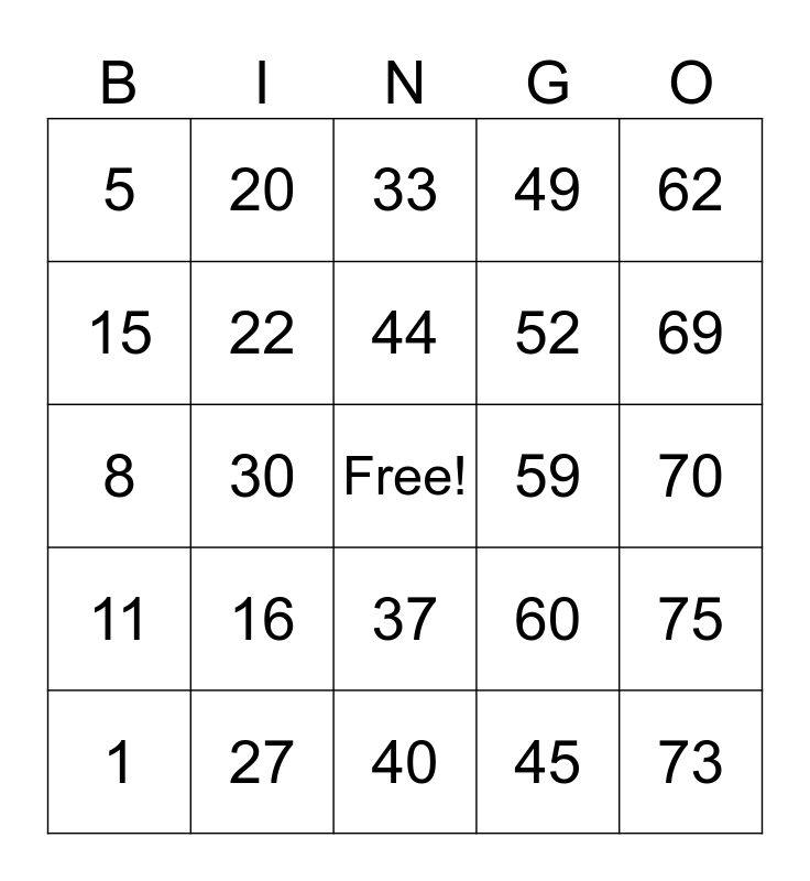 This bingo card has a free space and 24 words: 1, 16, 44, 45, 62, 5, 20, 33, 59, 70, 8, 22, 60, 75, 15, 27, 40, 49, 69, 11, 30, 37, 52 and 73.