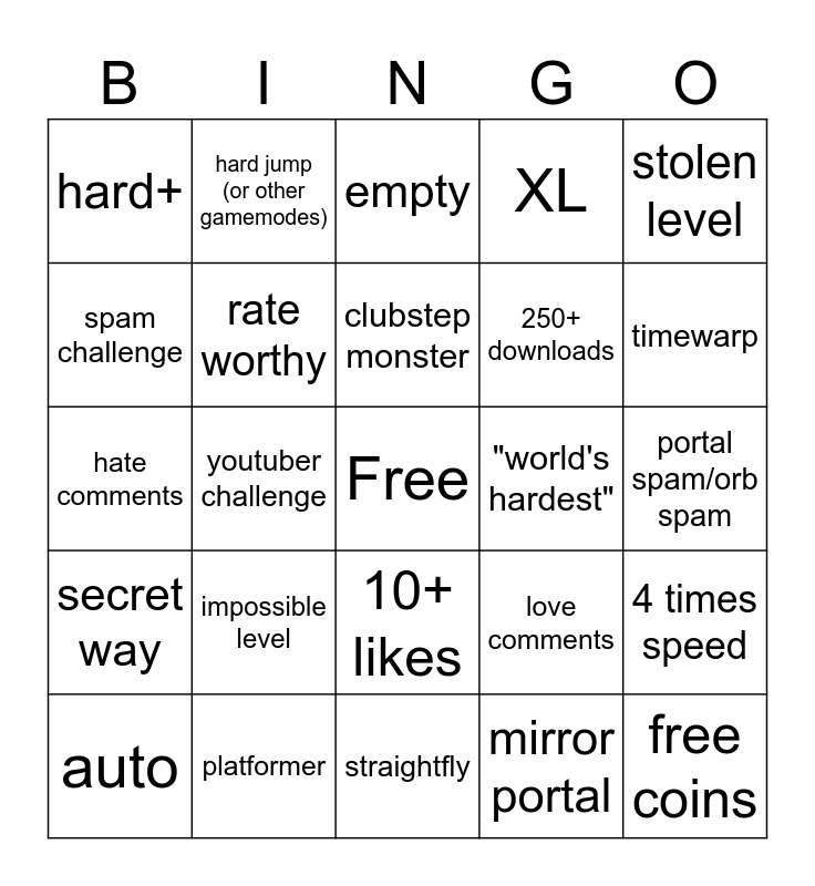 This bingo card has a free space and 24 words: impossible level, platformer, clubstep monster, auto, stolen level, hard+, spam challenge, hard jump (or other gamemodes), "world's hardest", 10+ likes, 250+ downloads, hate comments, love comments, 4 times speed, rate worthy, mirror portal, portal spam/orb spam, empty, timewarp, youtuber challenge, free coins, secret way, XL and straightfly.