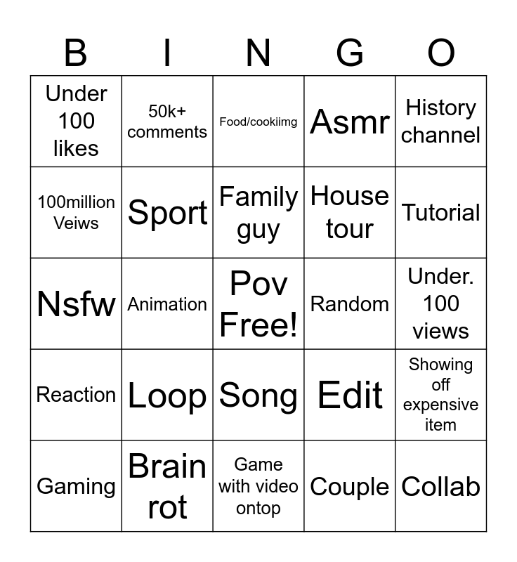 This bingo card has a free space and 24 words: Loop, Brain rot, Family guy, Gaming, History channel, Under 100 likes, 100million Veiws, 50k+ comments, Random, Song, House tour, Nsfw, Edit, Showing off expensive item, Sport, Couple, Under. 100 views, Food/cookiimg, Tutorial, Animation, Collab, Reaction, Asmr and Game with video ontop.