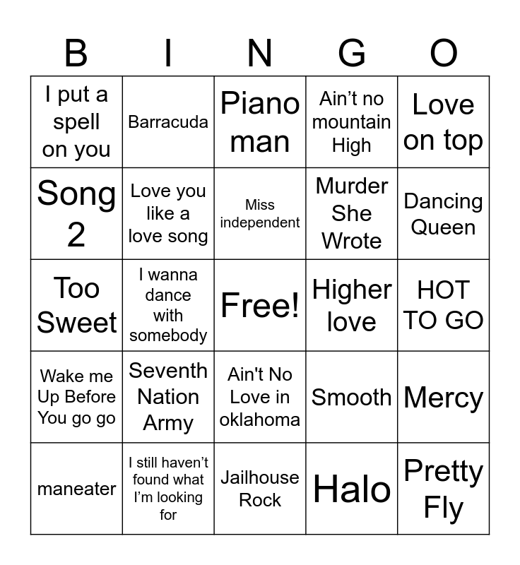 This bingo card has a free space and 52 words: I love rock n roll, Pretty Fly, Rock you like a hurricane, Jailhouse Rock, Seventh Nation Army, Cherry Pie, Barracuda, Fight for your right, Song 2, Waterfalls, Love you like a love song, Suddenly I see, Mercy, Smooth, Paper planes, Ain’t no Sunshine, Miss independent, Higher love, The doc of the bay, Love on top, I wanna dance with somebody, Halo, I put a spell on you, Murder She Wrote, Bills bills bills, Nonsense, Brave, Super base, Dancing Queen, Sweet emotion, Uptown Girl, Ain’t no mountain High, Sweet Caroline, Girls just want to have fun, Got my mind set on you, Piano man, I still haven’t found what I’m looking for, Africa, Come on Eileen, Walking on sunshine, American pie, HOT TO GO, Wake me Up Before You go go, Kiss, Ain't No Love in oklahoma, Aint nobody, Ain't no Other man, Too Sweet, My Sharona, Purple rain, maneater and kokomo.