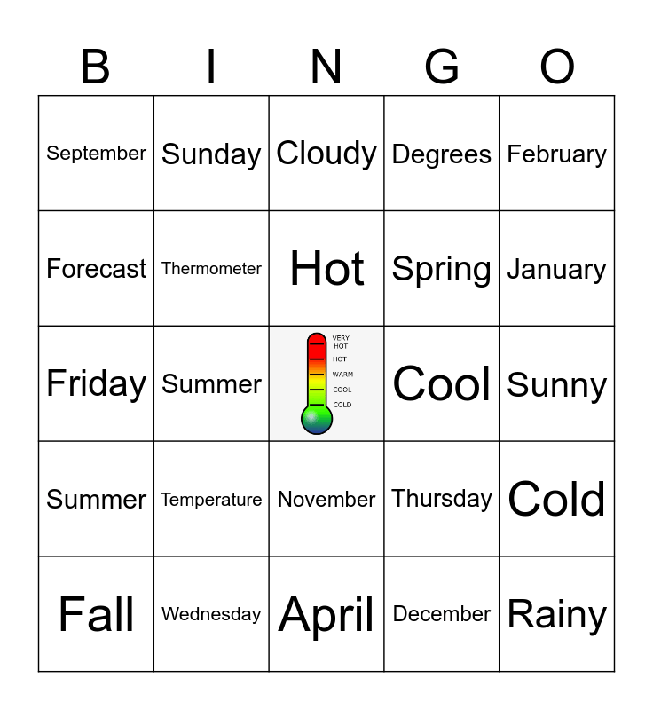 This bingo card has a free space and 38 words: Weather, Warm, Windy, Thermometer, Cold, Temperature, Hot, Snowy, February, Spring, Summer, Degrees, Rainy, Sunny, Forecast, Summer, Winter, Cloudy, Monday, Cool, September, Wednesday, January, Fall, March, April, May, June, July, August, October, November, December, Sunday, Tuyesday, Thursday, Friday and Saturday.