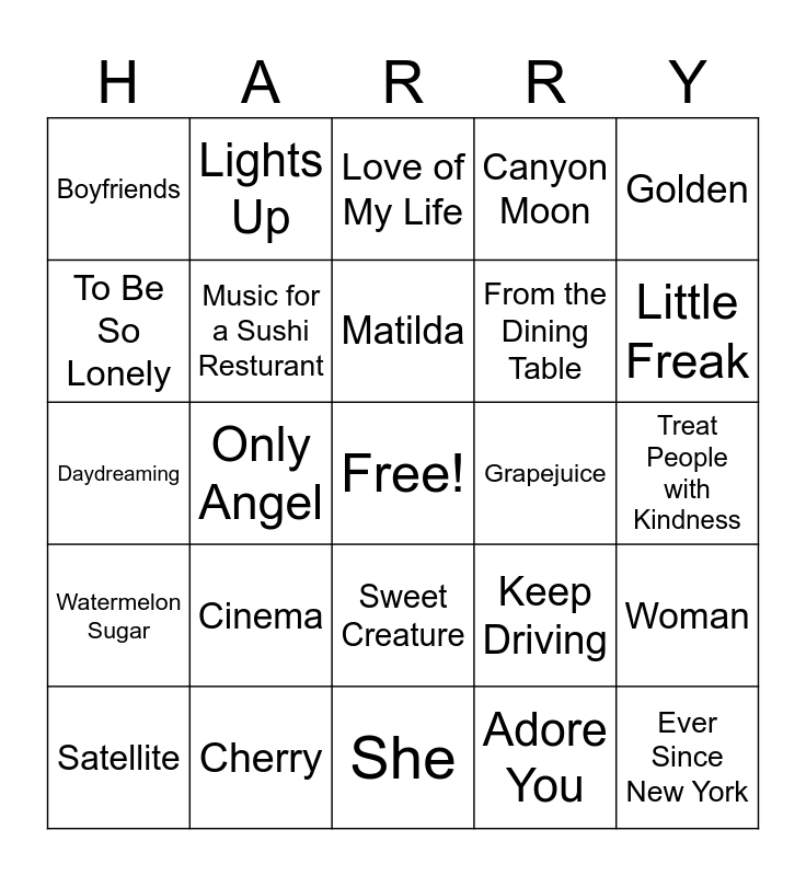 This bingo card has a free space and 34 words: As It Was, Adore You, Late Night Talking, Sign of the Times, Watermelon Sugar, Music for a Sushi Resturant, Golden, Satellite, Lights Up, Daylight, Matilda, Love of My Life, Falling, Kiwi, Grapejuice, Little Freak, Cherry, Daydreaming, Cinema, Keep Driving, Sweet Creature, Sunflower Vol. 6, Boyfriends, Treat People with Kindness, She, Ever Since New York, Canyon Moon, Two Ghosts, From the Dining Table, To Be So Lonely, Carolina, Only Angel, Woman and Girl Crush.